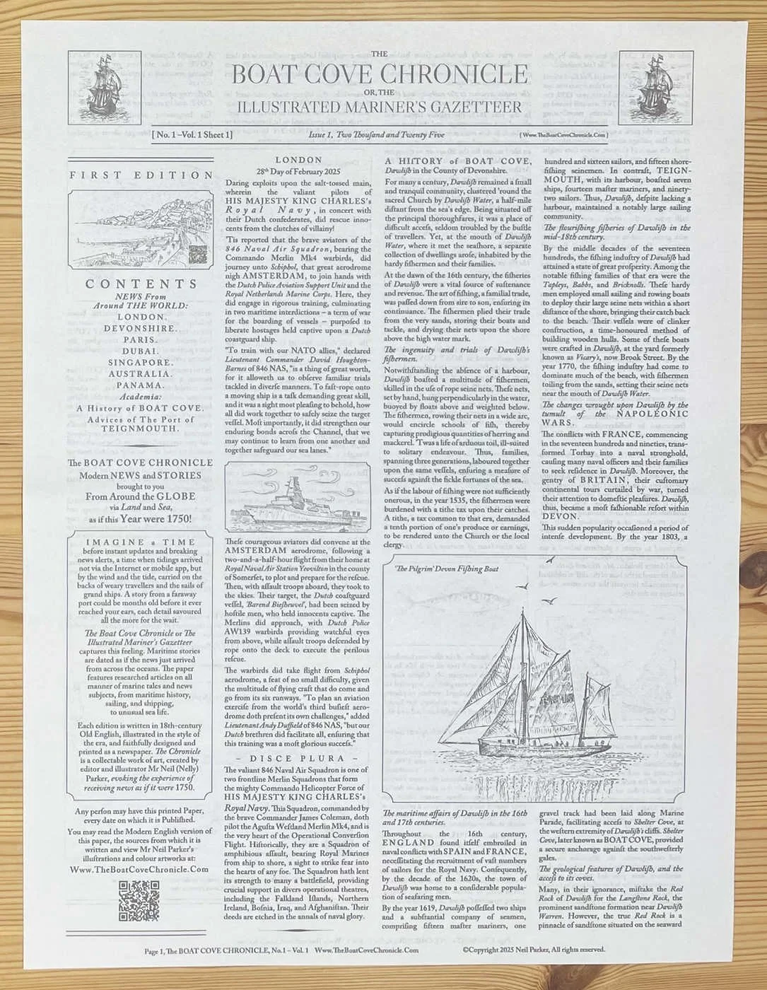 The Boat Cove Chronicle is a printed maritime newspaper that faithfully recreates the experience of receiving news in 1750. Created by artist and writer, Neil Parker.